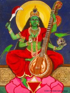 In many ways, Matangi is closely related to Saraswati, wife of Brahma and the goddess of knowledge, music, wisdom and art. That is why one of her forms is depicted as playing the veena. The parrots represent speech and the veena represents music. However, while Saraswati embodies the orthodox knowledge of the upper caste Brahmins, Matangi embodies the knowledge that is beyond mainstream conventional society. For all these reasons and more, this is one of my favorite forms of the goddess.