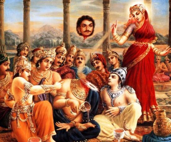 Happily, Arjuna succeeded, with some assistance from the wily Krishna. Arjuna used a divine arrow to deliver Jayadratha’s head to Jayadratha ’s father’s lap. Why? Because Jayadratha’s father had given him the boon that anyone responsible for his head falling to the ground would automatically explode. When the head landed on his lap, Jayadratha’s father leaped to his feet in horrified startlement. Guess what happened? Hint: It wasn’t pretty.