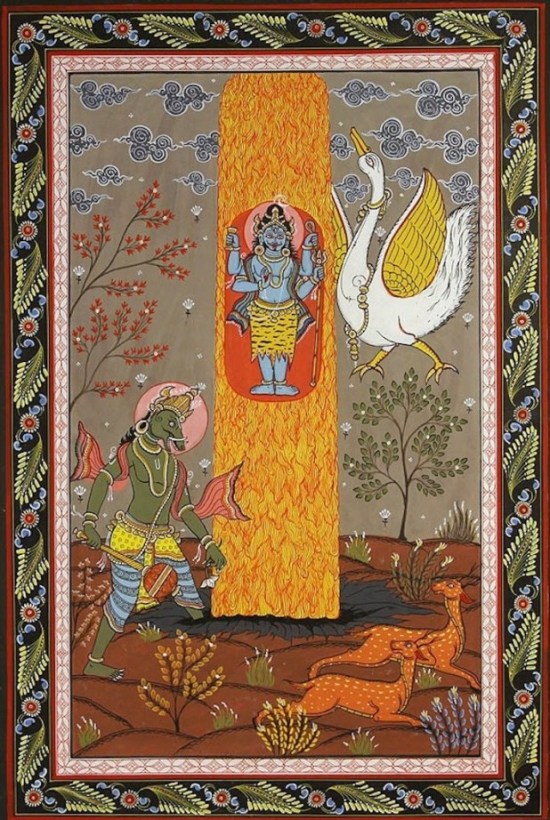 Brahma’s fifth head was chopped off by Shiva for basically being an egotistical liar. Right in the beginning, there was a terrible battle between Brahma and Vishnu. Shiva manifested as a huge column of fire between them – the origin of the famous phallic symbol, yes. Seeing this, Brahma and Vishnu were amazed and decided to find where the top and the bottom of the column were. Vishnu, in the form of a boar, went in search of the root and Brahma, in the form of a swan, went in search of the top. Vishnu went very far down, further than the netherworld, but couldn’t find the bottom of the pillar. Exhausted, he returned. Meanwhile, Brahma had come across the ketaki flower. He made the flower promise to lie to Vishnu and support his claim that he had reached the top of the column. The flower obliged. Vishnu believed the lie and began to worship Brahma. Then Shiva manifested himself. He praised Vishnu for his honesty and said that he would have an equal status to himself. As for Brahma, Shiva chopped off the head that had uttered the foolish lie.